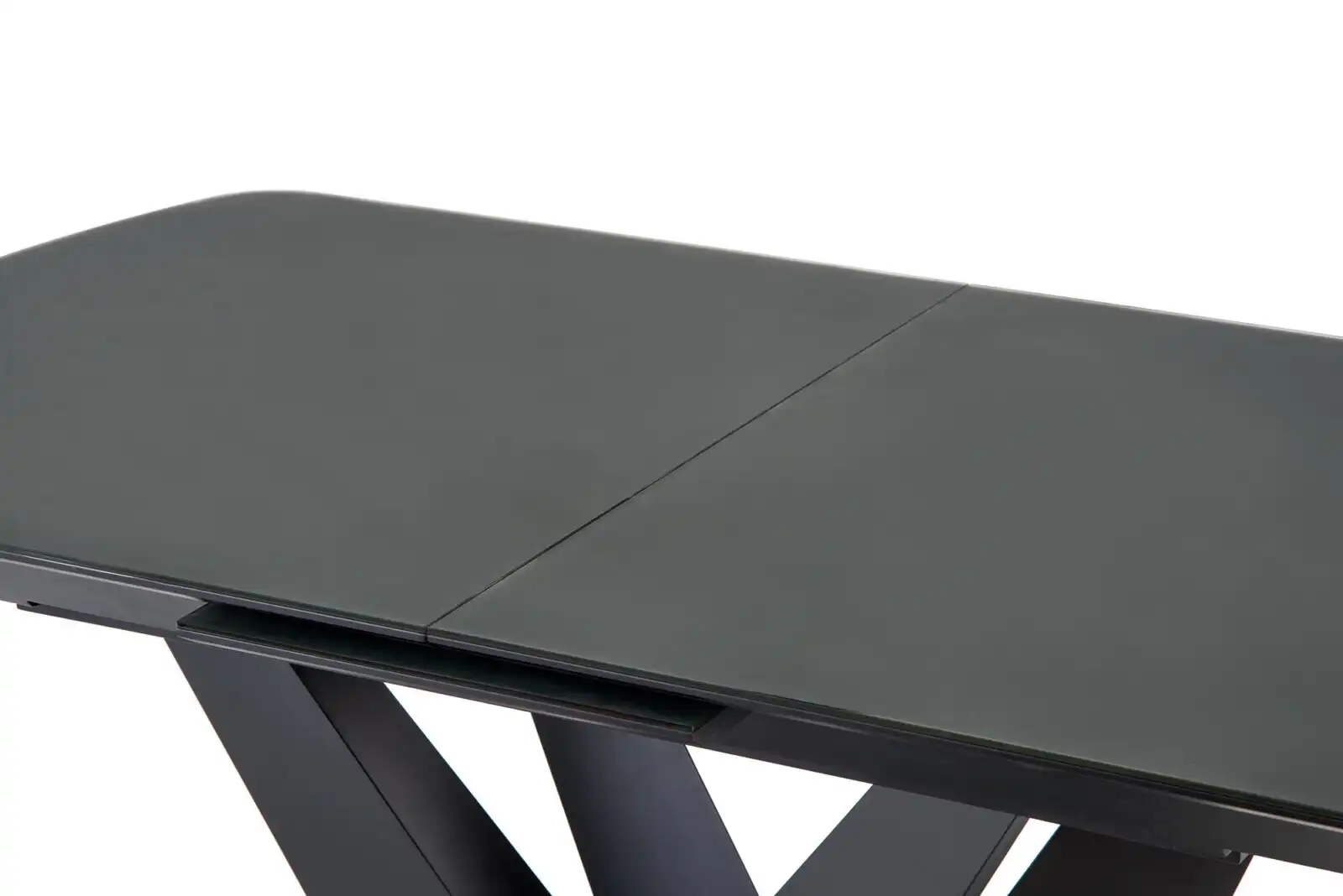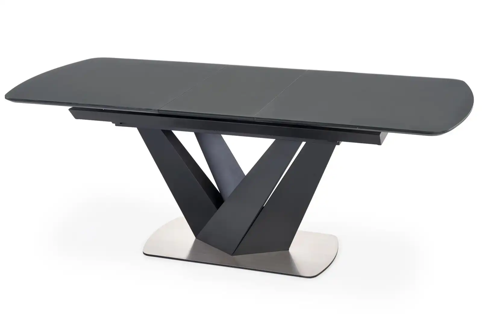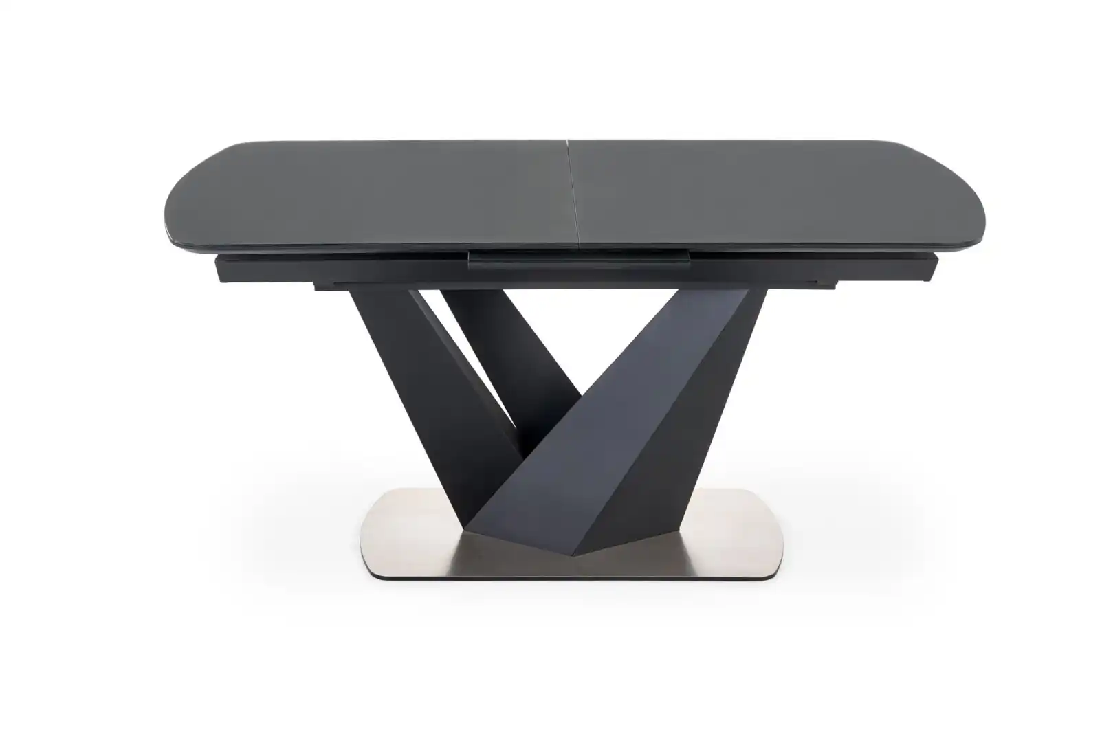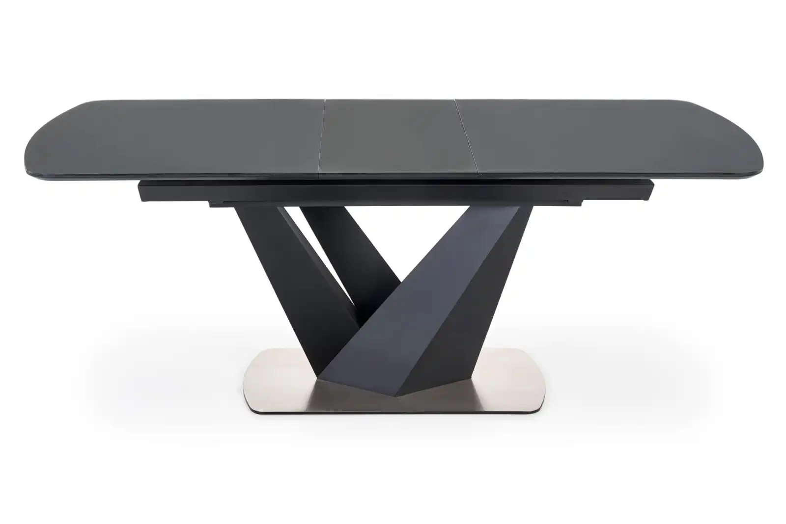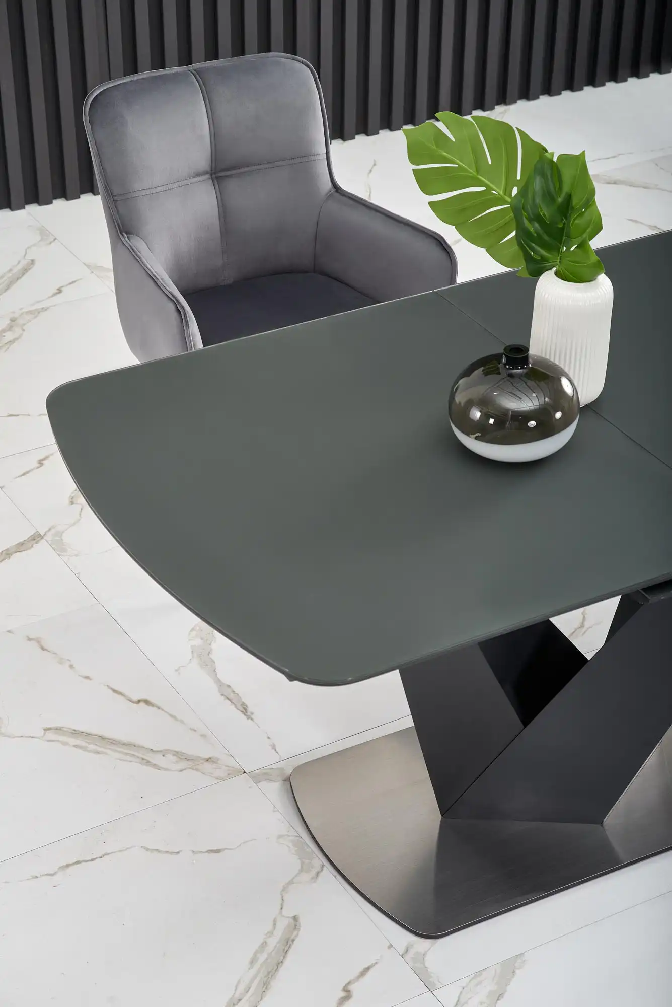 méretek: 160-200/90/77 cm, kihúzható asztal, anyag: üveg / lakkozott MDF – matt / rozsdamentes acél, szín: tető – sötétszürke, lábak – fekete