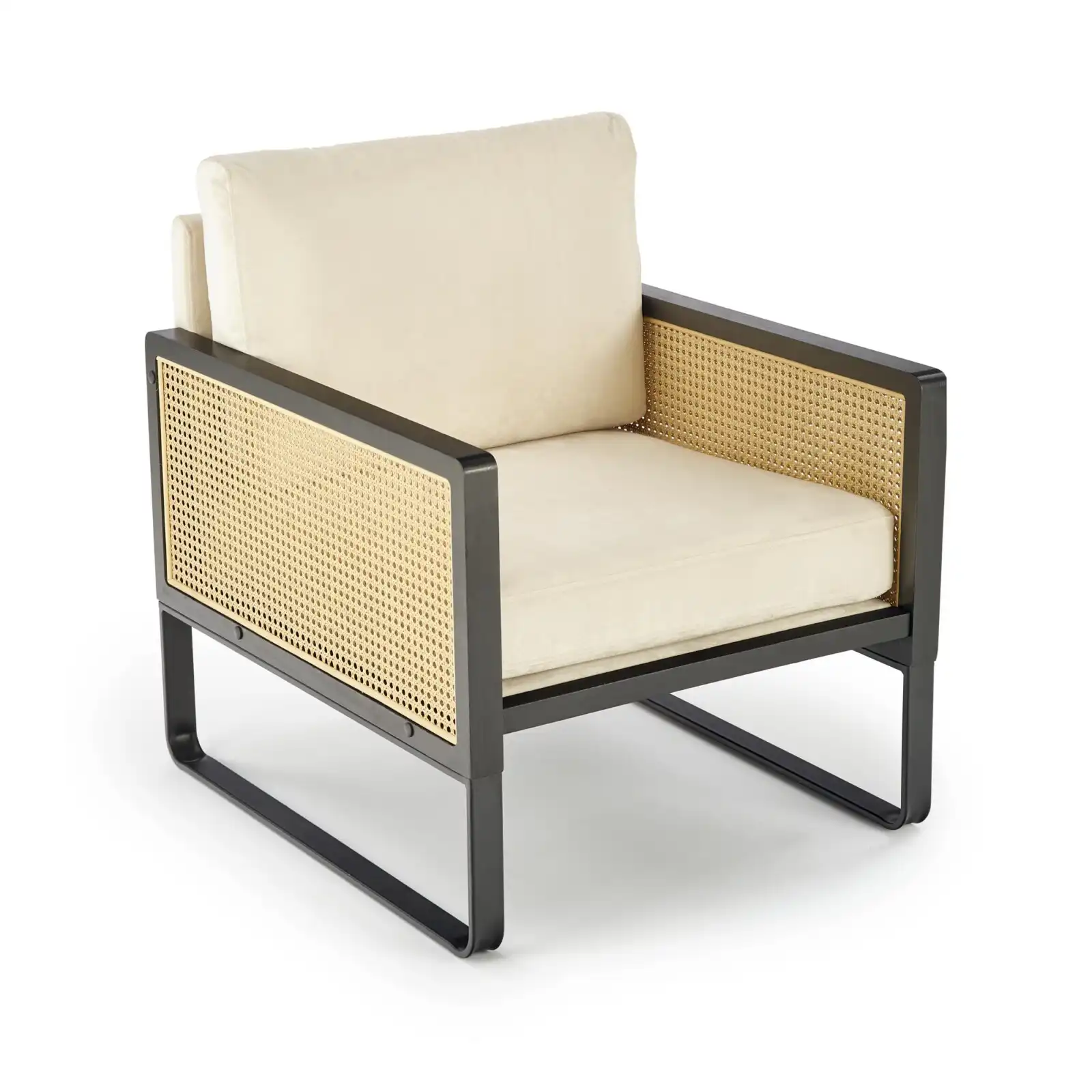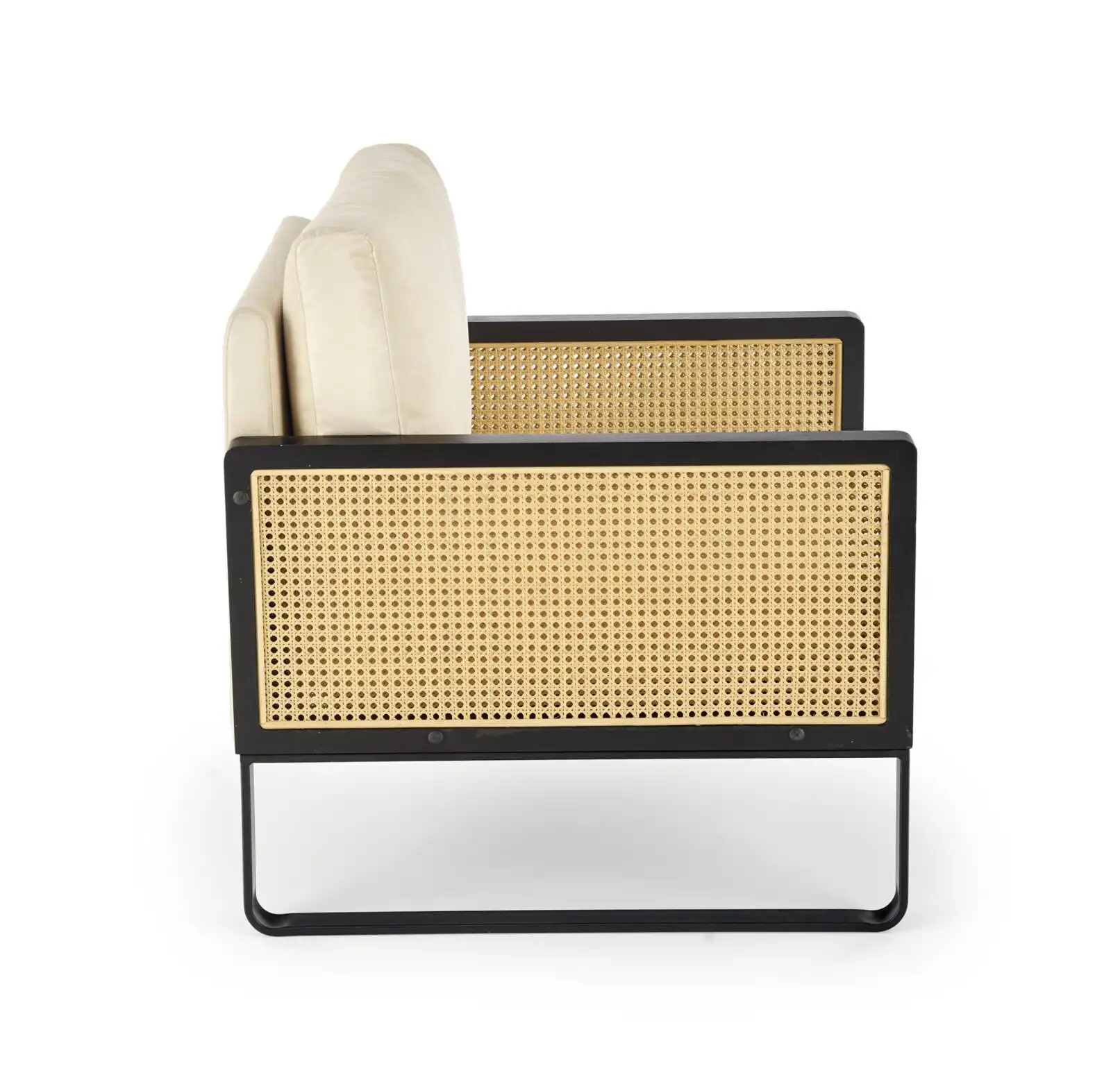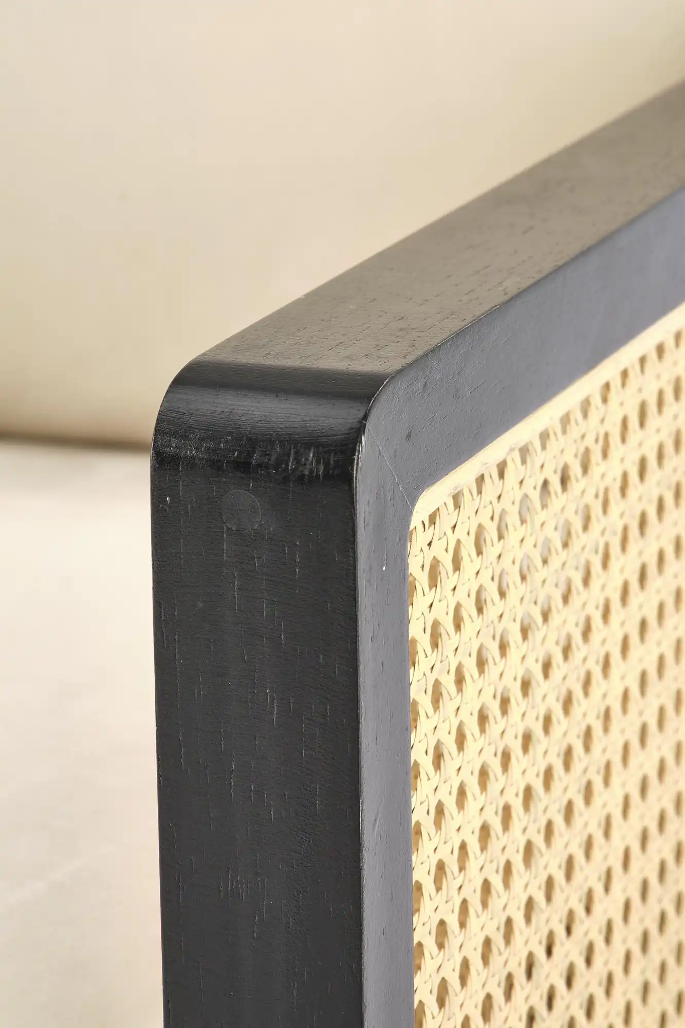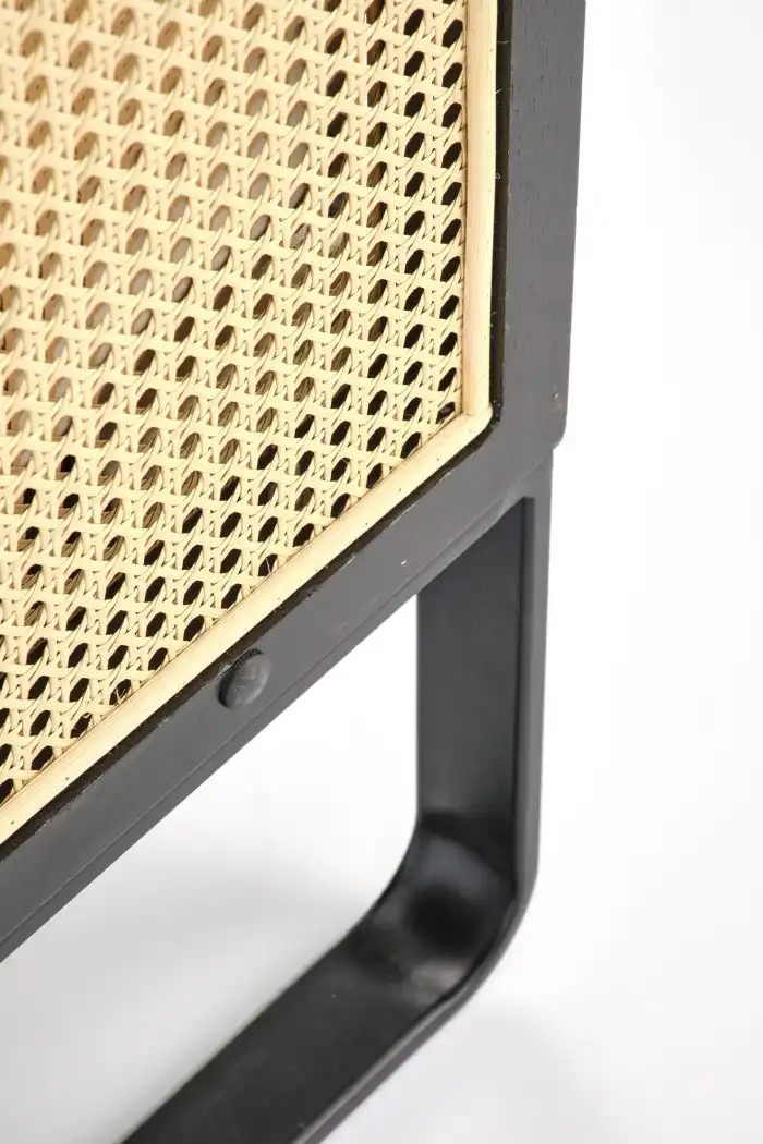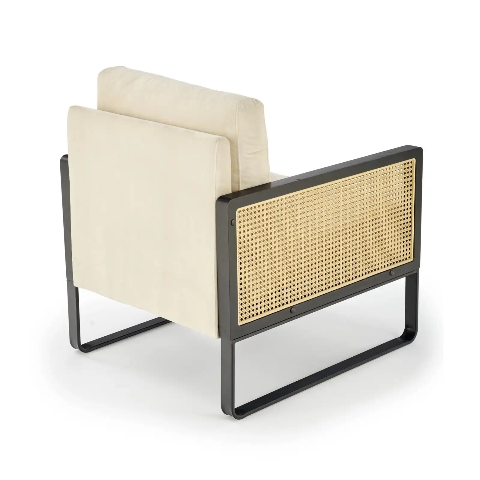 méretek: 64/67/77/40 cm, anyag: bársony szövet / műrattan / porfestett acél / tömör fa, szín: fekete – natúr – világos bézs