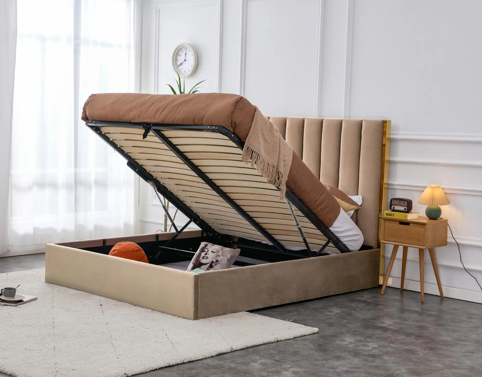 ágy ágyneműtartóval, anyag: bársony szövet / rozsdamentes acél, szín: bézs / arany – BLUVEL 40, * ágy matrac nélkül, opcionális matrac POLARIS 160 vagy SYRIUSZ 160